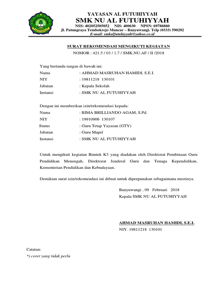 Contoh Surat Rekomendasi Nu - Contoh Surat Resign Bank Mandiri Backup Gambar. Ada beberapa hal yang perlu diperhatikan dalam penyusunan surat resmi ini. Kepala surat rekomendasi, terdiri atas kop surat dibuat lengkap dengan alamatnya. Hehe aku yakin kalian semua sudah pernah membuatnya, jika belum. Contoh surat permohonan rekomendasi nu. Perlu diketahui, surat rekomendasi merupakan surat yang menyatakan penilaian terhadap kapabilitas maupun kinerja seseorang.